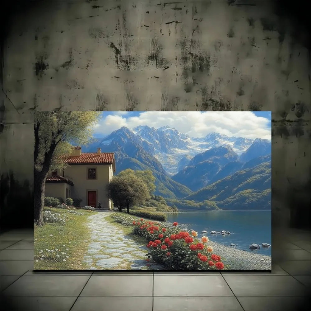 1.5 inch thick wood pine frame, interior art mural, home decor mural, wood frame depicting red flowers by the river