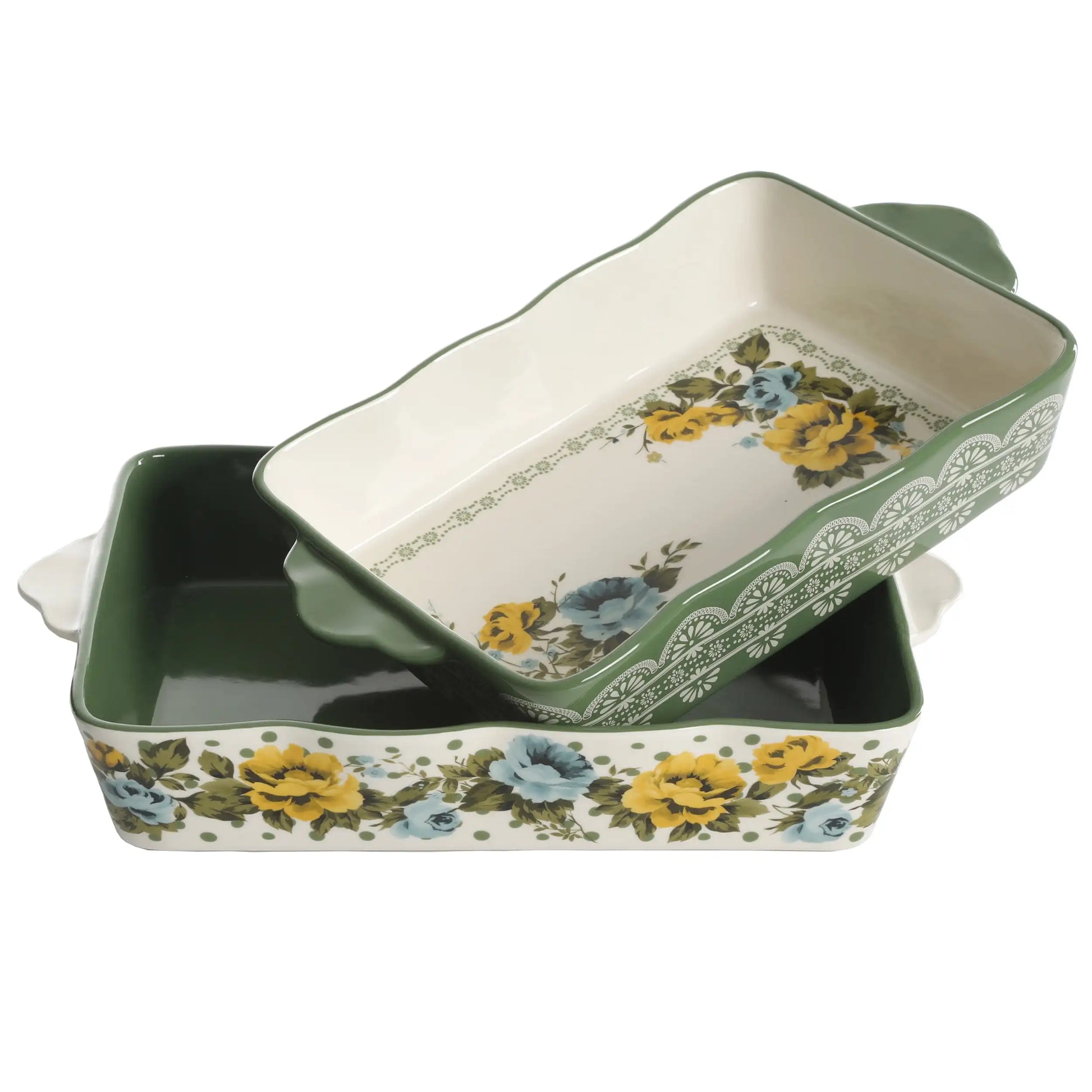 This 2-piece bakeware set makes it easy to bake and serve mouth-watering treats and delicious desserts. Practical and attractive, these bakeware are perfect for baking any delicious dessert or hearty casserole. Bright colors and floral patterns complement the classic design of these timeless bakeware, while subtle ruffles add a vintage touch to your culinary creations. Convenient built-in handles make it a breeze to take delicious dishes from the oven to the table. Made of durable stoneware, this bakeware set includes two rectangular bakeware, one measuring 12 inches and the other measuring 14 inches. Each piece in this set is oven, microwave, and dishwasher safe, making this 2-piece bakeware set not only beautiful and practical, but also a great addition to your bakeware collection.