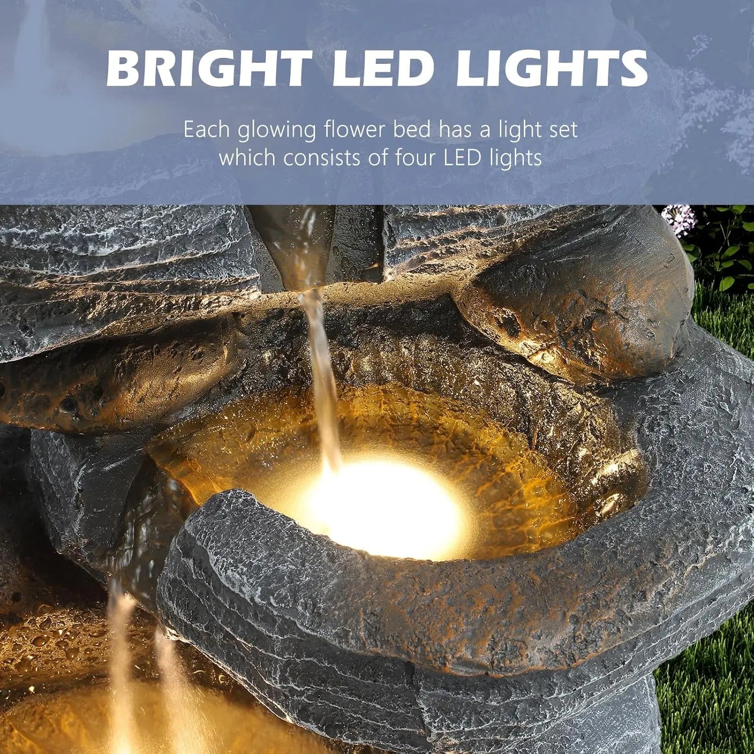 - Five-tier cascading design creates four soothing waterfalls, enhanced by two small birds and four warm LED lights for a tranquil focal point.